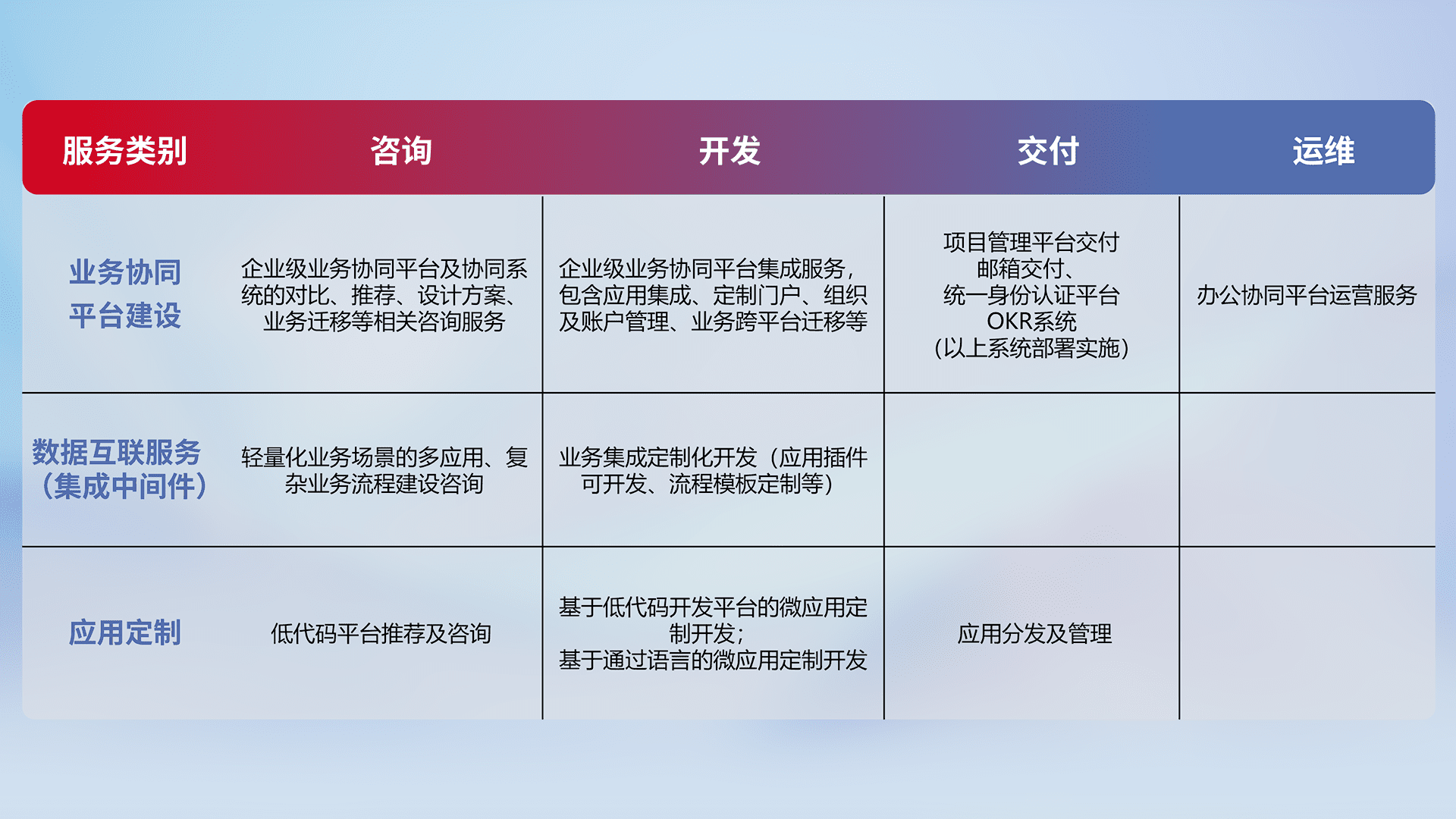 针对钉钉、、、企微、、、、IDaas等平台级产品提供产品的规划、、、方案、、、交付、、定制化开发等服务,,实现如统一协同办公、、、、智能客户服务、、、混合会议管理、、、智能数据查询、、、、等业务场景,,实现数字化转型。。。。